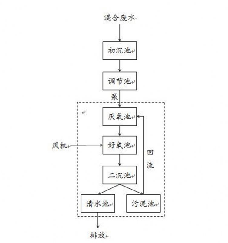 工藝流程如下圖所示,廢水進(jìn)入污水站內(nèi)的初沉池,分級沉淀污水中的部分顆粒雜質(zhì);初沉池出水進(jìn)入調(diào)節(jié)池中積存,廢水在其中均值均量,以維持系統(tǒng)運行的穩(wěn)定性;調(diào)節(jié)池中的水由泵送入一體化生化設(shè)備的厭氧池,此單元主要功能是厭氧把大分子有機物分解為小分子,以利于后續(xù)好氧處理;厭氧后自流進(jìn)入設(shè)備好氧池,風(fēng)機曝氣供氧進(jìn)行好氧反應(yīng)能分解有機物,降低污水污染程度;好氧結(jié)束后,池中的水自流經(jīng)導(dǎo)流筒進(jìn)入二沉池,污水在其中沉淀,泥水分離,污泥下沉,清水經(jīng)溢流堰溢流、收集后自流進(jìn)入清水池;清水池中水由自流排放下級污水官網(wǎng)。
