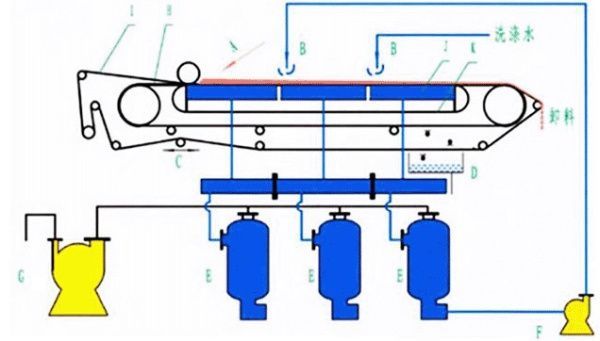 A、加料裝置 B、淋洗裝置 C、糾偏裝置 D清洗裝置 E氣液分離器 F、反水泵 G、真空泵 H、橡膠帶 I、濾布 J、真空盒 K。磨擦帶