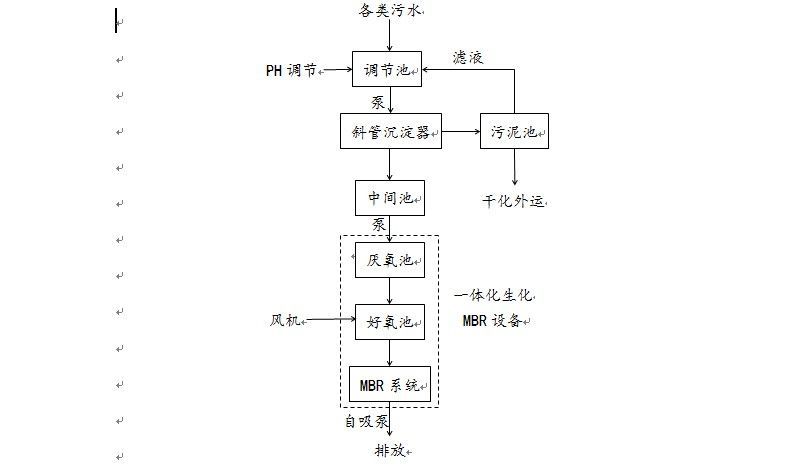 各類污水排入PH調(diào)節(jié)池混合,加藥進(jìn)行PH調(diào)節(jié);調(diào)節(jié)池調(diào)節(jié)PH后的污水由泵送入斜管沉淀器加藥沉淀固體顆粒及懸浮物;斜管沉淀器出水自流進(jìn)入中間池存放;中間池的水由泵連續(xù)抽送進(jìn)入一體化生化MBR設(shè)備的厭氧池,此單元主要功能把大分子有機(jī)物分解為小分子,以利于后續(xù)好氧處理;厭氧后的水自流進(jìn)入好氧池,風(fēng)機(jī)曝氣供氧進(jìn)行好氧反應(yīng)能分解去除大部分有物;好氧池中的水由浮球液位計(jì)控制后續(xù)MBR膜系統(tǒng)的啟閉,其主要作用是進(jìn)一步將一體化處理設(shè)備中的出水凈化,確保出水的COD、SS、BOD等各項(xiàng)指標(biāo)達(dá)標(biāo)后排放或回用。